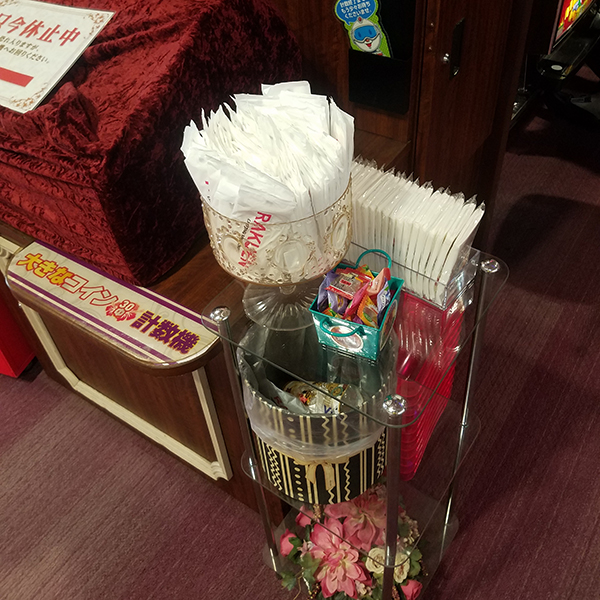 忙しい中でも迅速に遊技のサポートがおこなわれているため、プレイヤーたちは快適に遊技を楽しめている様子だった。また計数機の横におしぼりだけでなく、アメなどのお菓子が置かれていて、スタッフの心使いを感じられる。