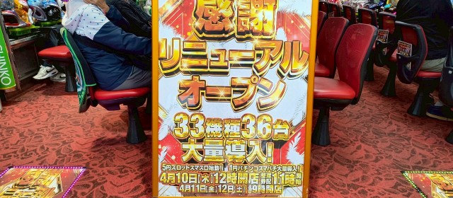 この日同店では、5スロにスマスロ・1パチにスマパチなど、新機種が大量導入された。通常営業よりも開店を3時間を遅らせたが、その出玉状況が気になるところ。