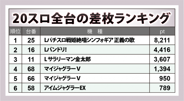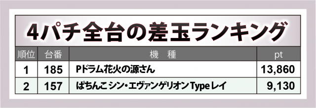 この6台のうち4桁プラスは4台、+3,000枚以上は3台、+4,000枚以上は2台、そして+8,000枚オーバーは1台と、限られた営業時間の中でもビッグヒットが飛び出したことは喜ばしい。
