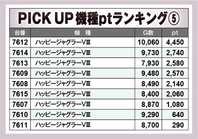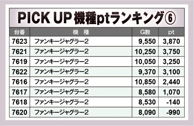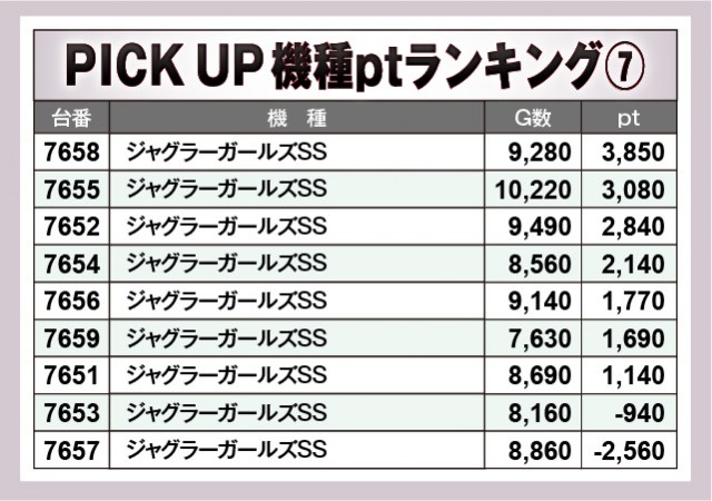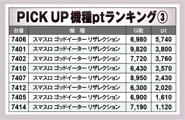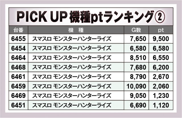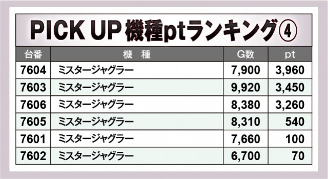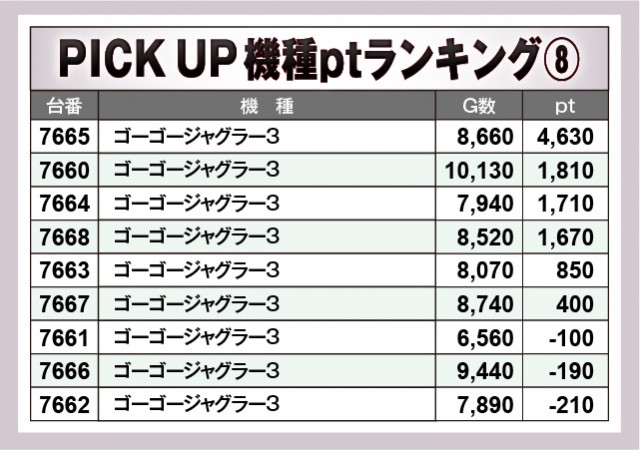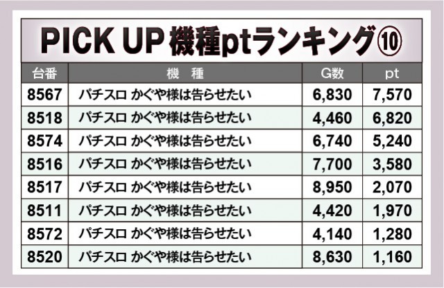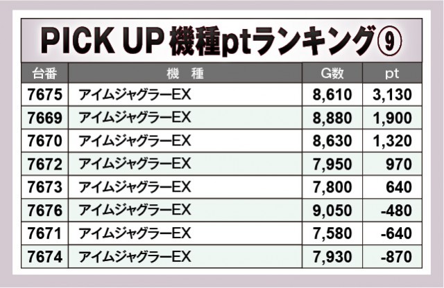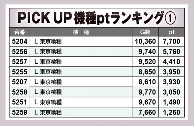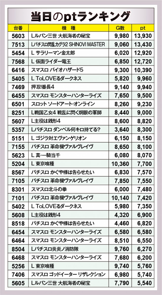 何よりも鮮烈な記録として、上表の30台は5,000pt OVERからとなっており、いかに店内が盛り上がっていたのかが窺える。その中で『Lルパン三世 大航海者の秘宝』『Lパチスロ閃乱カグラ2 SHINOVI MASTER』『L サラリーマン金太郎』『L 仮面ライダー電王』『スマスロ バイオハザード5』が万pt OVERを達成。他にも万枚未遂台の存在や万回転OVER台など、凄まじい熱気だけでなく活気が絶えない状況だったのが見て取れるばかりだ。