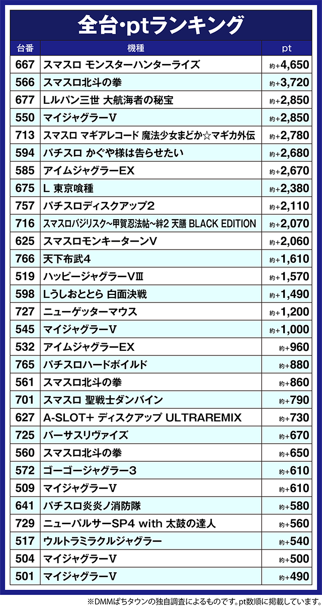 ほかにも、「パチスロ かぐや様は告らせたい」や「アイムジャグラーEX」などに約+2,000ptを超えた台があった。
