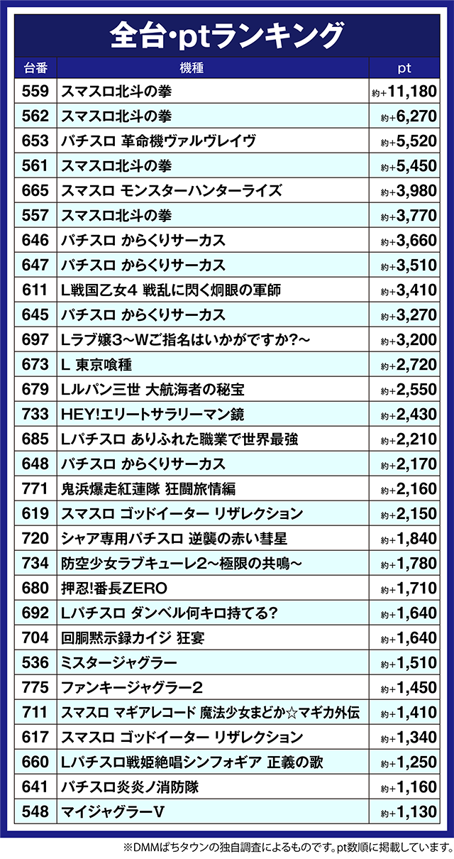約+6,200ptを超えた562番台など、機種全体で4台が約+2,100pt以上となった。