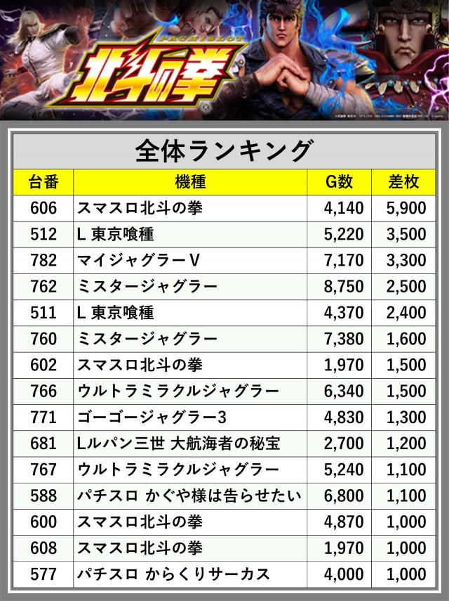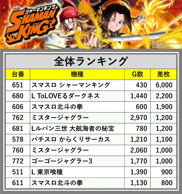※差枚数順に掲載しています