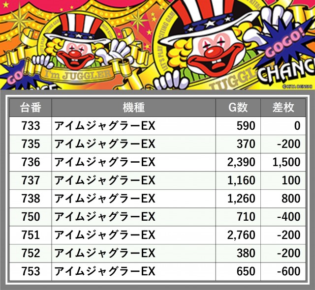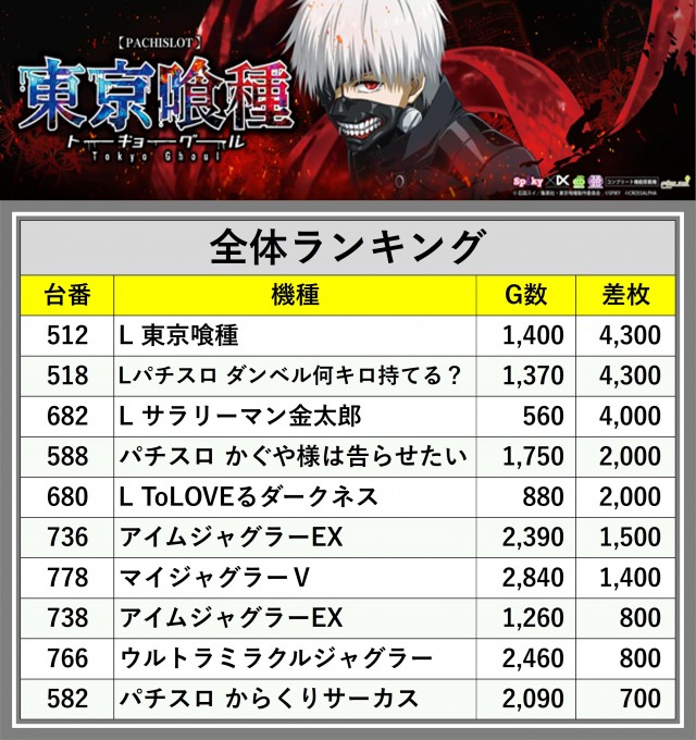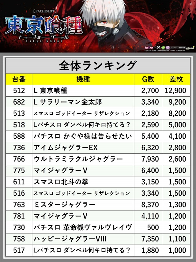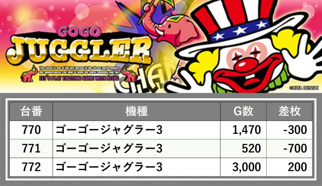 厳選された取材対象機種をはじめ、その他スロット全体から好記録が飛び出した!プレイヤーが楽しんだ1日を下記データにて振り返ってみて欲しい。