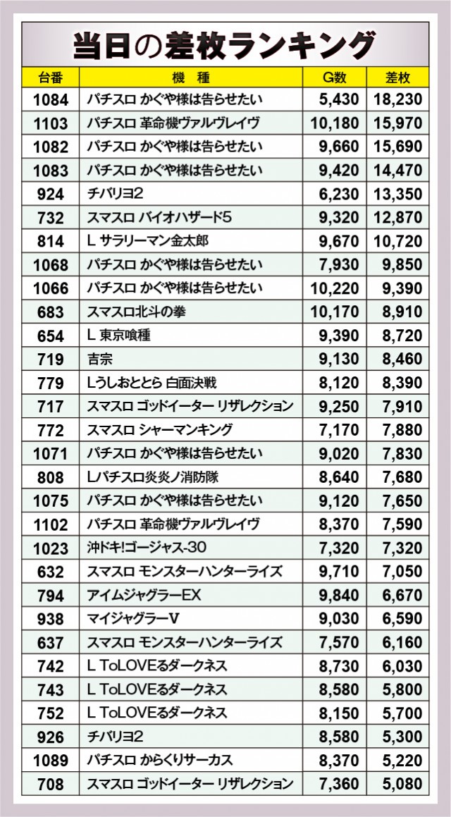 『パチスロ かぐや様は告らせたい』『パチスロ 革命機ヴァルヴレイヴ』『チバリヨ2』『スマスロ バイオハザード5』『L サラリーマン金太郎』にて合計7台の万枚OVERが飛び出し、さらに8~9,000枚台も多々確認できる。何よりも上表は5,000枚OVERからとなっているため、館内の大きな熱量が窺えるばかりだ。そして複数の万回転OVERを筆頭に終日を通して打ち込まれており、いかに手応えを感じられる状況だったのかも見て取れる。