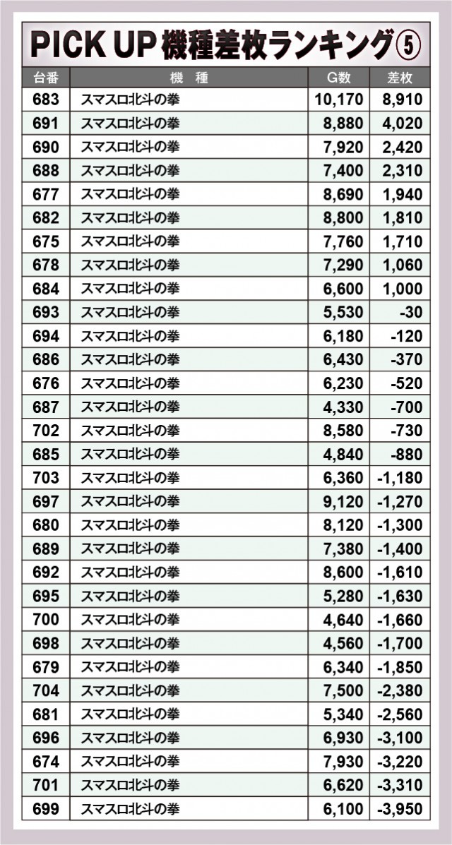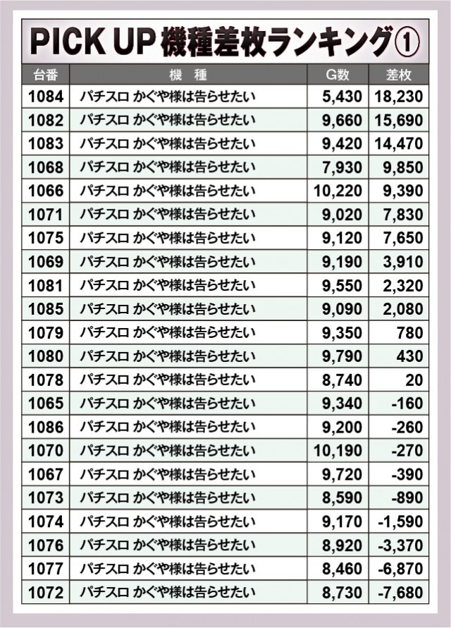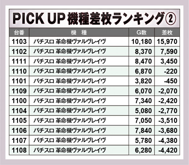 3台の万枚OVERを輩出した『パチスロ かぐや様は告らせたい』、『パチスロ 革命機ヴァルヴレイヴ』もその勢いに追随し、圧巻のパフォーマンスを披露していた。もちろん他の優秀機種も熱を帯びており、『L ToLOVEるダークネス』『スマスロ ゴッドイーター リザレクション』『スマスロ北斗の拳』は大台突破台が発生。『スマスロモンキーターンV』も展開に恵まれなかったものの活気に満ちた状況で、これら優秀機種の高いパフォーマンスが上表から窺えるばかりだ。