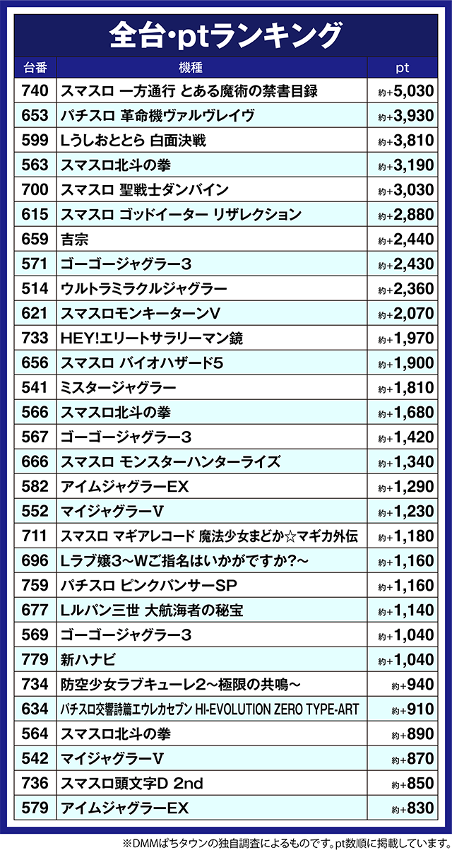 「スマスロ ゴッドイーター リザレクション」の615番台や「吉宗」の659番台なども約+2,000pt以上と、多くの台が結果を残した。