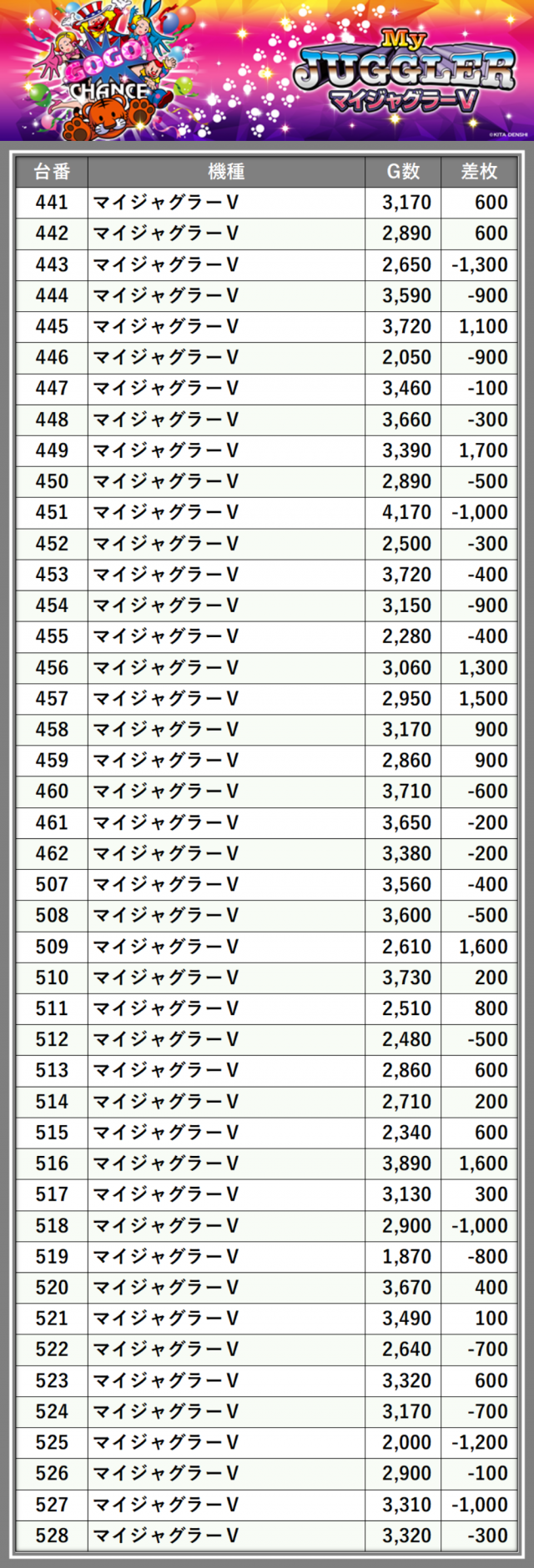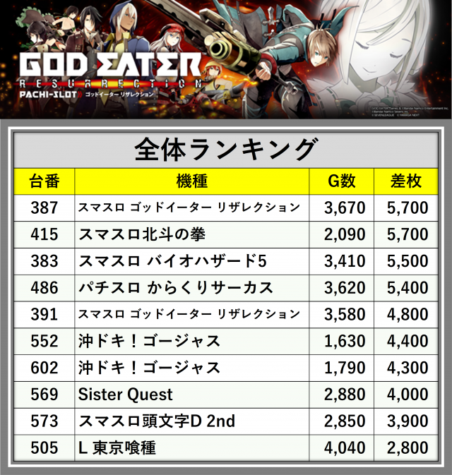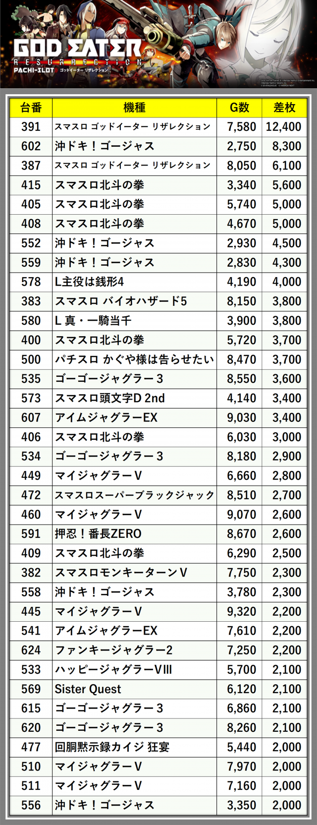 厳選された取材対象機種をはじめ、その他スロット全体から好記録が飛び出した!プレイヤーが楽しんだ1日を下記データにて振り返ってみて欲しい。