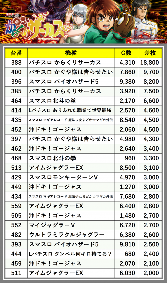 厳選された取材対象機種をはじめ、その他スロット全体から好記録が飛び出した!プレイヤーが楽しんだ1日を下記データにて振り返ってみて欲しい。