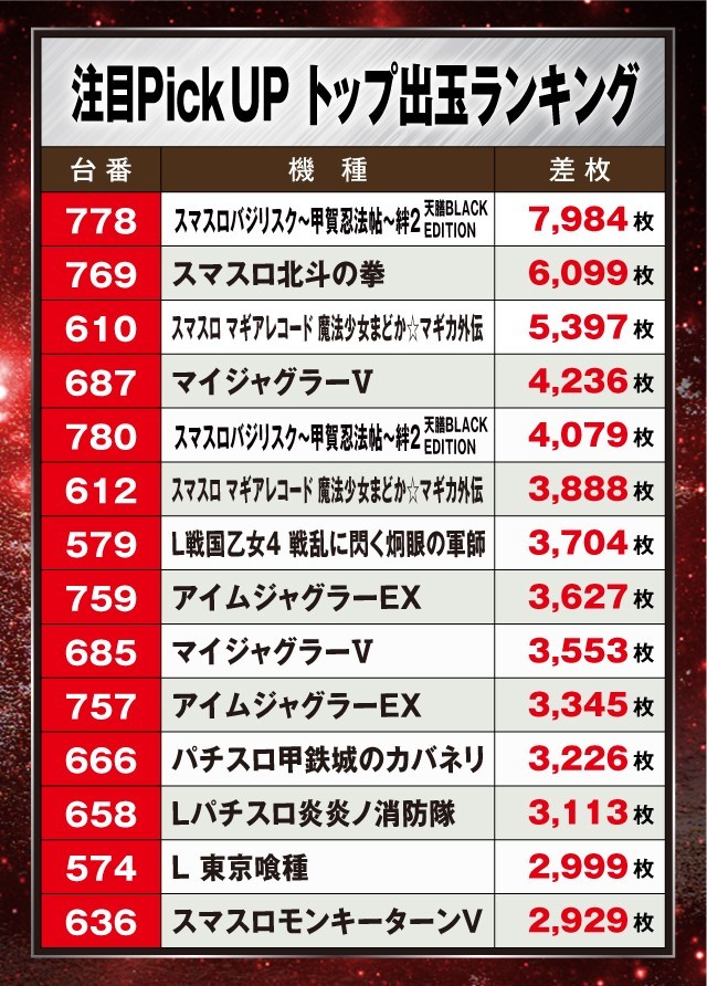早速、店内状況をチェックすると、『スマスロバジリスク~甲賀忍法帖~絆2 天膳BLACK EDITION』から+7,984枚と+4,079枚、『スマスロ マギアレコード 魔法少女まどか☆マギカ外伝』から+5,397枚と+3,888枚など、新旧を問わず人気のスマスロを中心に多数のハイスコアが確認された。