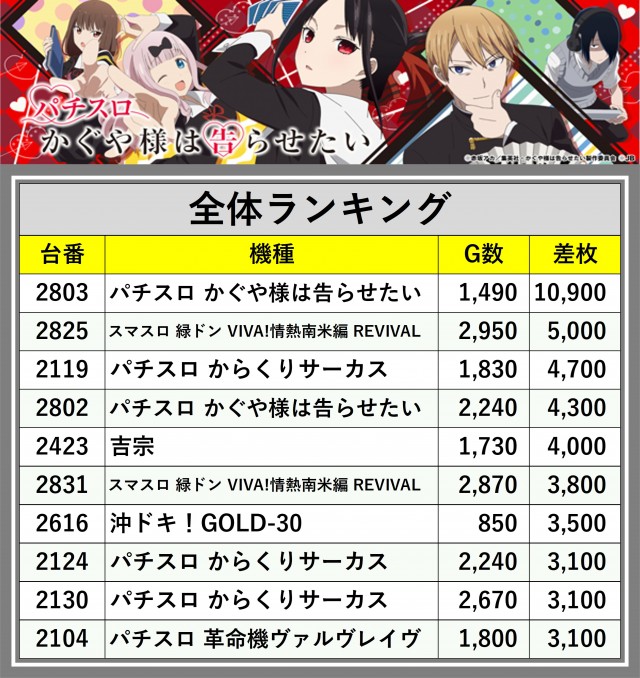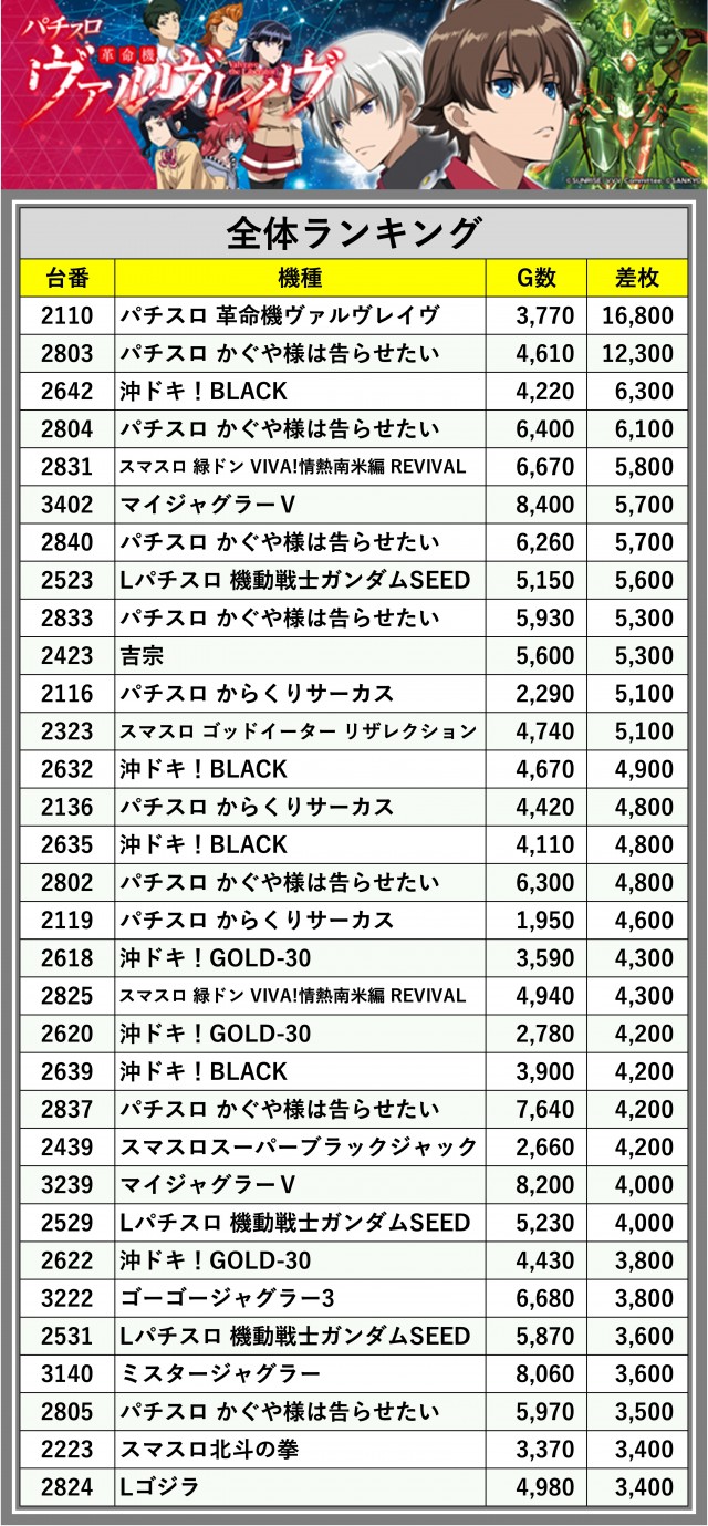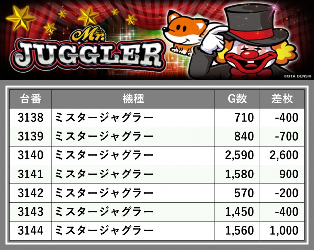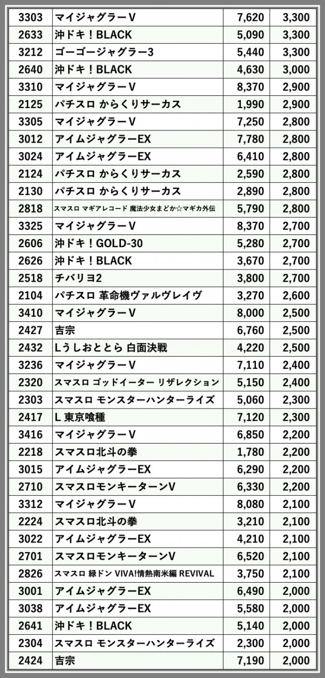 厳選された取材対象機種をはじめ、その他スロット全体から好記録が飛び出した!プレイヤーが楽しんだ1日を下記データにて振り返ってみて欲しい。
