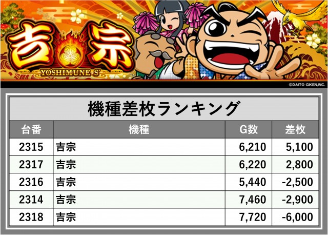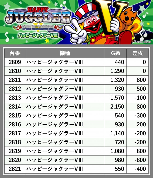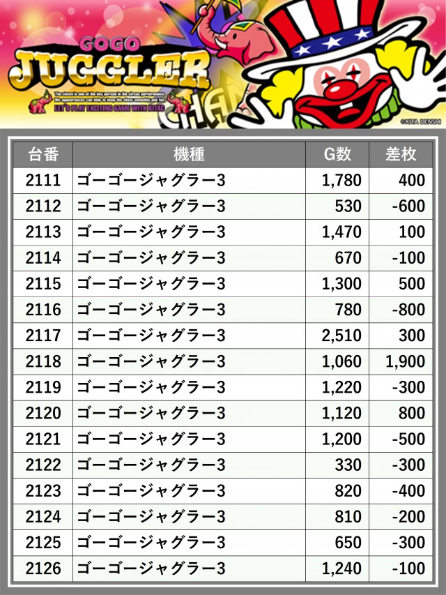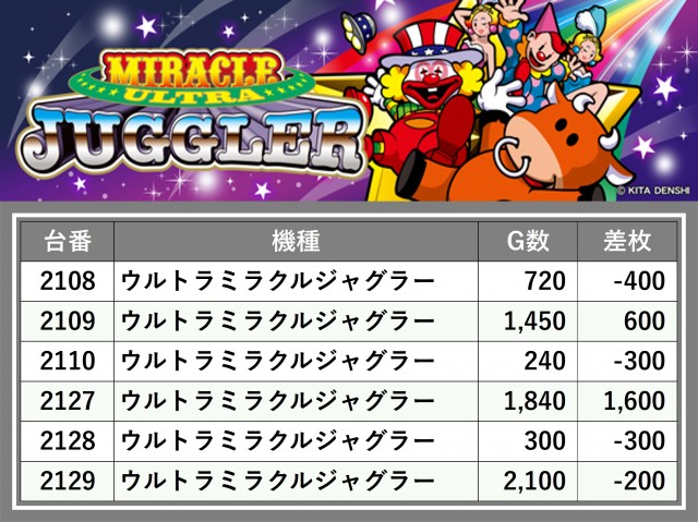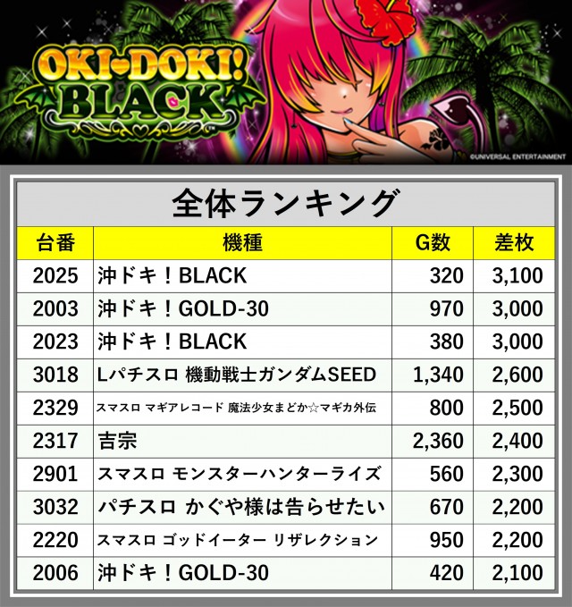 厳選された取材対象機種をはじめ、その他スロット全体から好記録が飛び出した!プレイヤーが楽しんだ1日を下記データにて振り返ってみて欲しい。