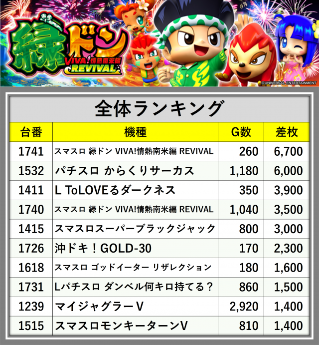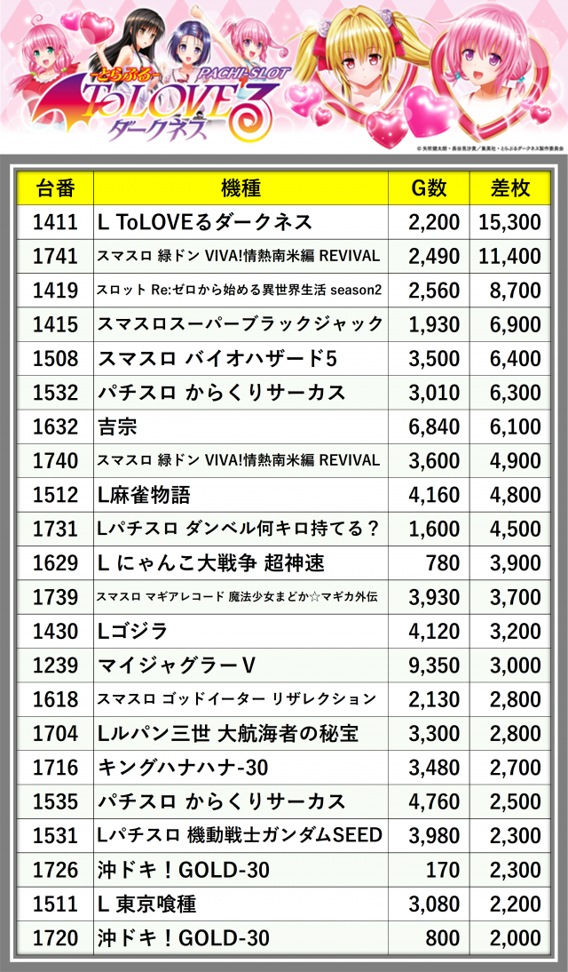 厳選された取材対象機種をはじめ、その他スロット全体から好記録が飛び出した!プレイヤーが楽しんだ1日を下記データにて振り返ってみて欲しい。