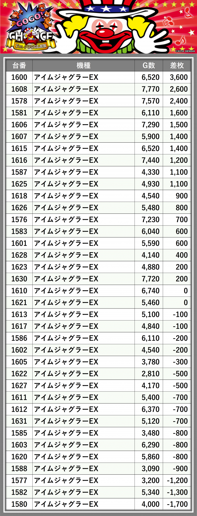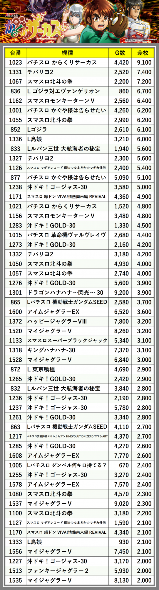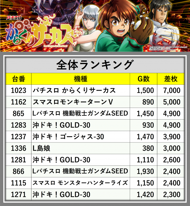 厳選された取材対象機種をはじめ、その他スロット全体から好記録が飛び出した!プレイヤーが楽しんだ1日を下記データにて振り返ってみて欲しい。