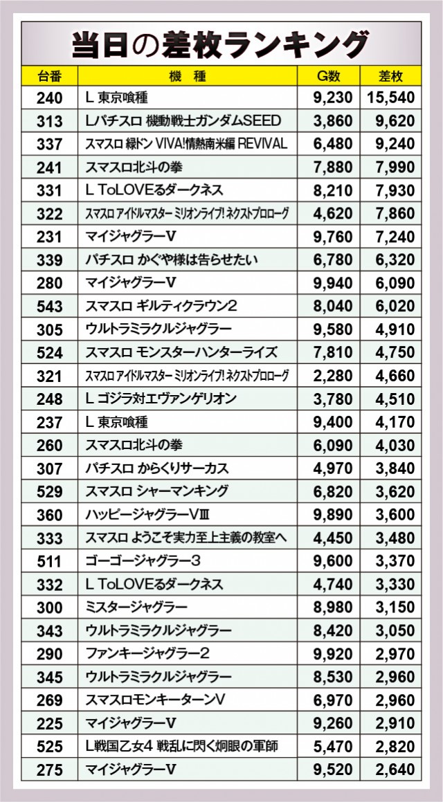 『L 東京喰種』にて万枚OVERが飛び出し、さらに『Lパチスロ 機動戦士ガンダムSEED』『スマスロ 緑ドン VIVA!情熱南米編 REVIVAL』でも9,000枚OVERが発生。他にも大台突破台が多数見られ、AT機から放たれた熱気は凄まじいものがあった。その中に『マイジャグラーⅤ』6,000枚OVERという大きな数字も確認でき、『ウルトラミラクルジャグラー』の4,000枚OVERも然り、ノーマル機も存在感をアピールしていた。