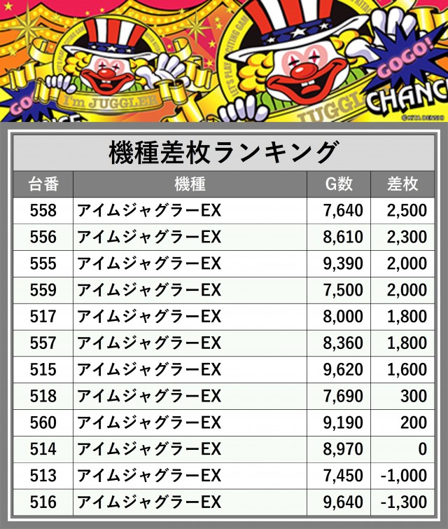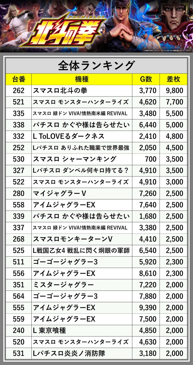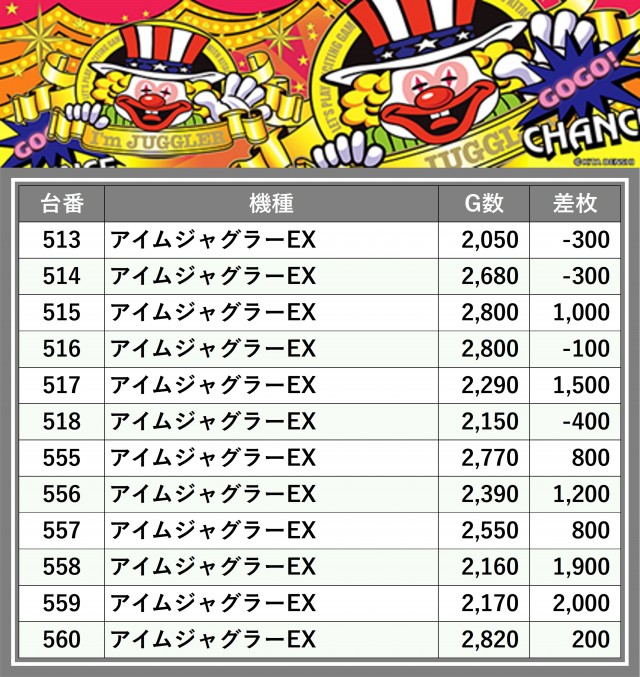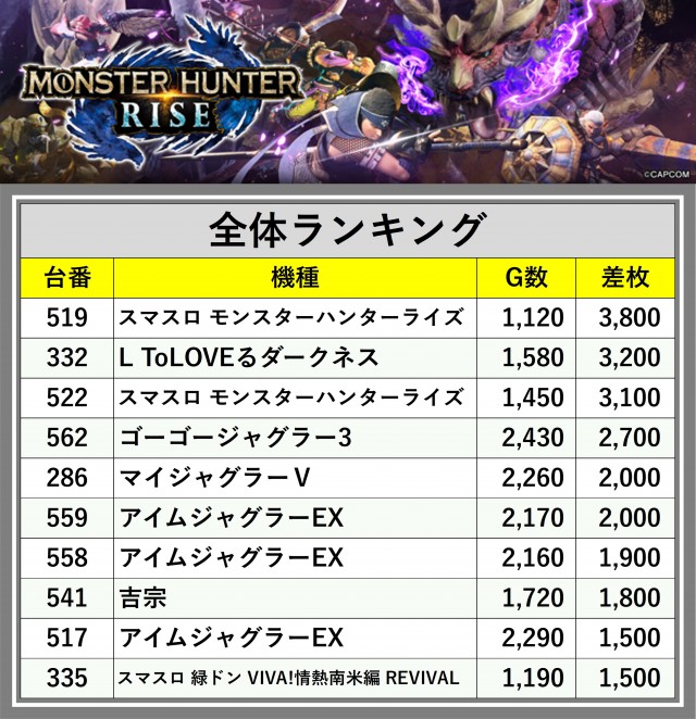厳選された取材対象機種をはじめ、その他スロット全体から好記録が飛び出した!プレイヤーが楽しんだ1日を下記データにて振り返ってみて欲しい。