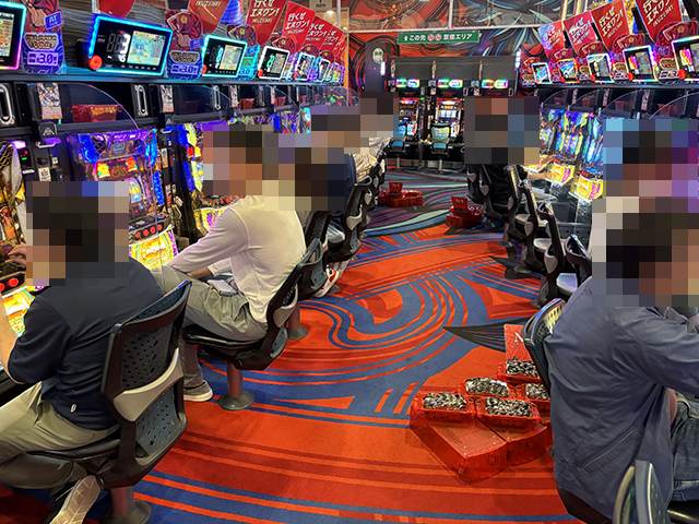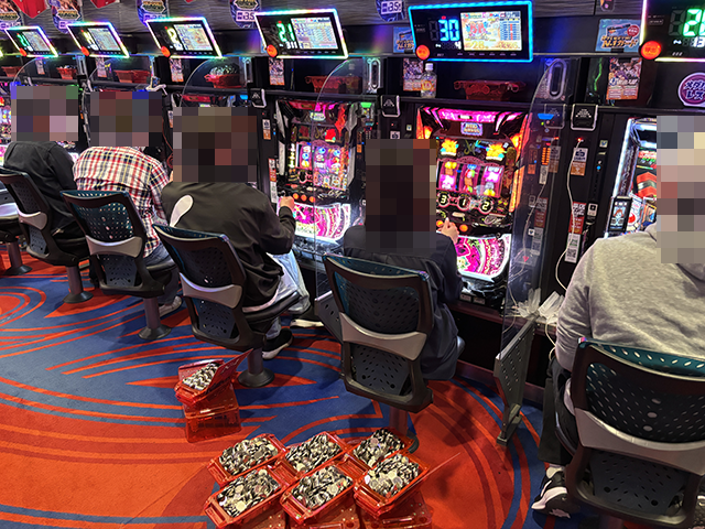 14時過ぎのパチスロでは、「沖ドキ!BLACK」に6箱以上、「沖ドキ!GOLD-30」に5箱以上の持ち玉アリ。