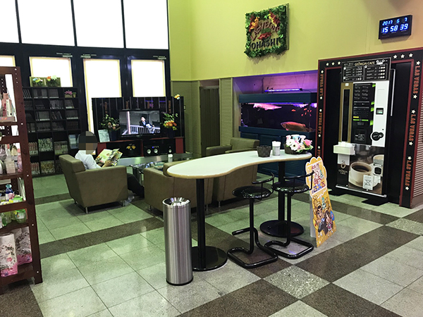 レストスペースには伸び伸びとできる椅子が揃えられ、開放感があり快適。また大きな水槽では熱帯魚が泳いでおり、心と体を癒してくれる。