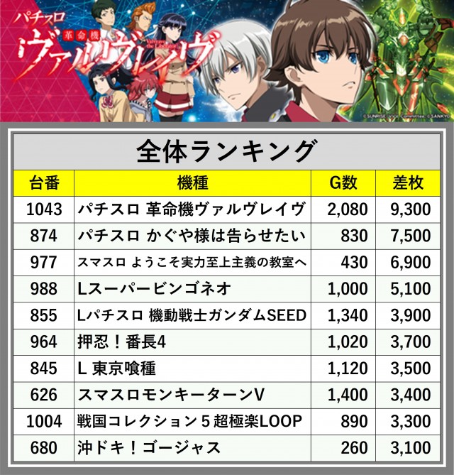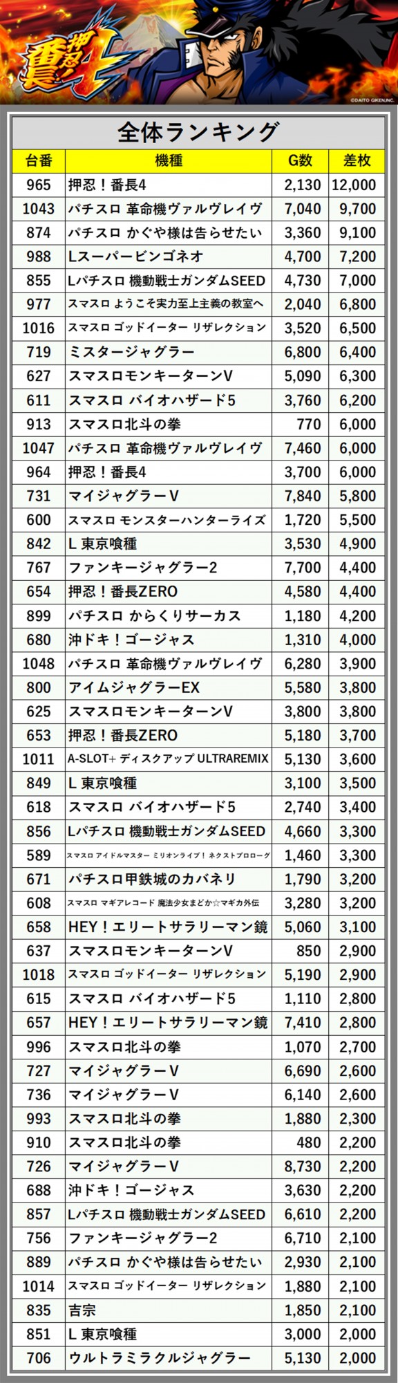 厳選された取材対象機種をはじめ、その他スロット全体から好記録が飛び出した!プレイヤーが楽しんだ1日を下記データにて振り返ってみて欲しい。