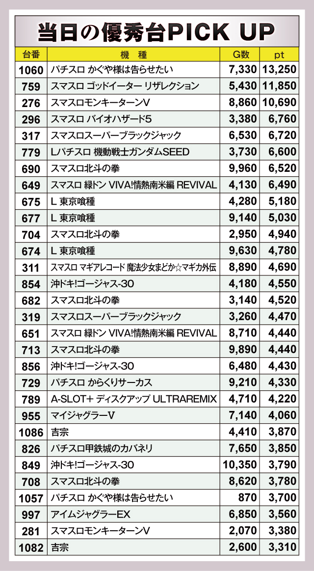 『パチスロ かぐや様は告らせたい』1060番台が+13,250pt、『スマスロ ゴッドイーター リザレクション』759番台が+11,850pt、『スマスロモンキーターンV』276番台が+10,690ptと3台が1万ptオーバーの見事な成績に。他にもこの日は大量設置のメイン機種はもちろん、少台数機種からも好調台が並ぶ様子が散見された。