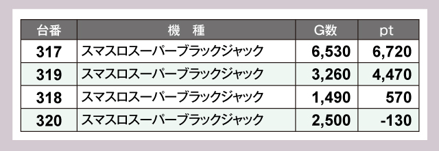 注目機種を見ていくと、『スマスロスーパーブラックジャック』は4台中3台がプラスpt。うち2台が存分にポテンシャルを発揮していた。