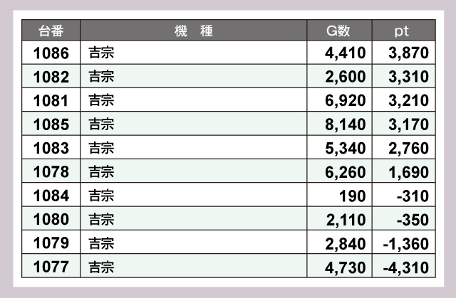 『吉宗』は10台中6台がプラスptで、いずれも1,000pt超えの優秀台となっている。