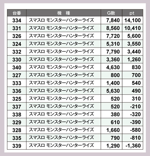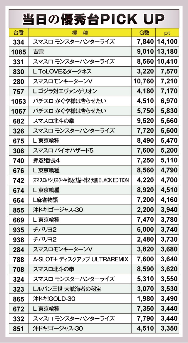続いては優秀機種を見てみよう。『スマスロ モンスターハンターライズ』はランキング1位の334番台+14,100ptをはじめ、331番台+10,410ptと見事なパフォーマンスを披露していた。