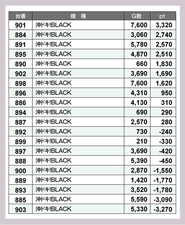 設置台数の多い『沖ドキ!BLACK』を見ると、+1,000pt超の優秀台が多く、プレイヤーの満足度はかなり高かったに違いない。
