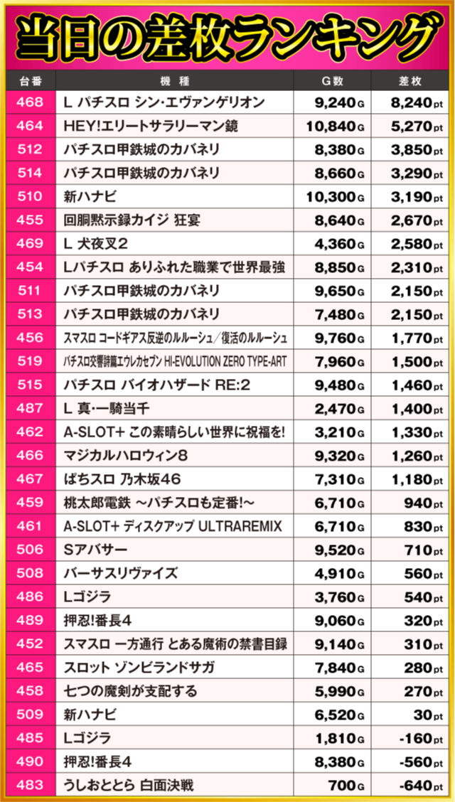 この日の店内状況を見てみると、『L パチスロ シン・エヴァンゲリオン』が+8,240ptを叩き出しランキングトップに。次いで『HEY!エリートサラリーマン鏡』から+5,270pt、『パチスロ甲鉄城のカバネリ』から+3,000pt超が2台発生する盛況ぶりであった。