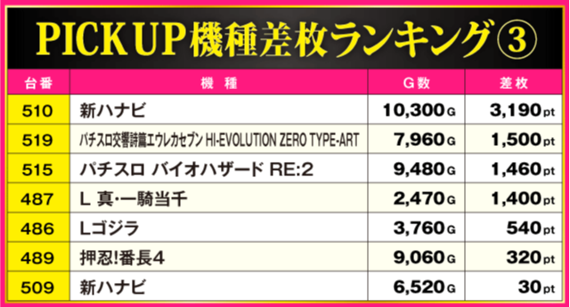 続いてPICK UP機種をチェック!! 同店の人気コーナーの一つであるマンガンバラエティとトイツバラエティは今回も絶好調で、多数の好調台が確認されている。また、ランキング上位に入った『パチスロ甲鉄城のカバネリ』は4台全てがプラス差枚という見事な結果を残しファンを喜ばせていた。