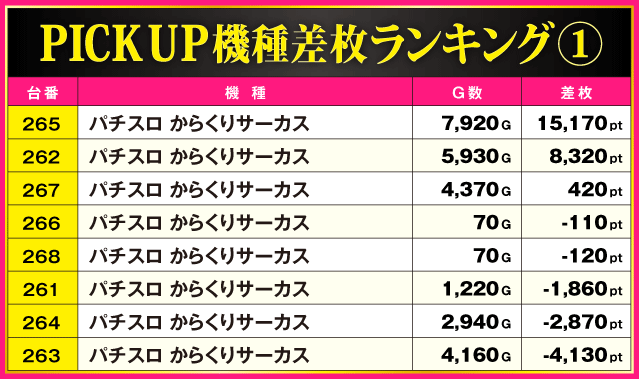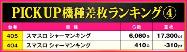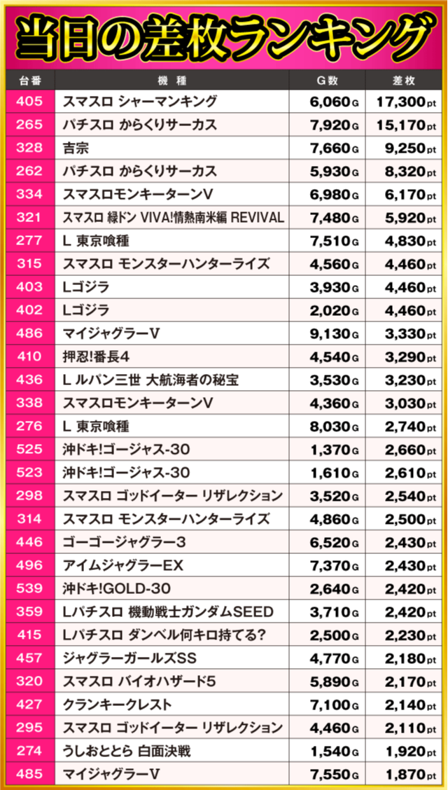 この日は、『パチスロ からくりサーカス』の+15,170ptをはじめ人気の主力AT機から数々のハイスコアが発生。さらに、『スマスロ シャーマンキング』が怒涛の+17,300ptを叩き出しており、台数が多いメイン機種だけでなく少台数機種にもしっかりとチャンスが潜んでいたのは間違いないだろう。