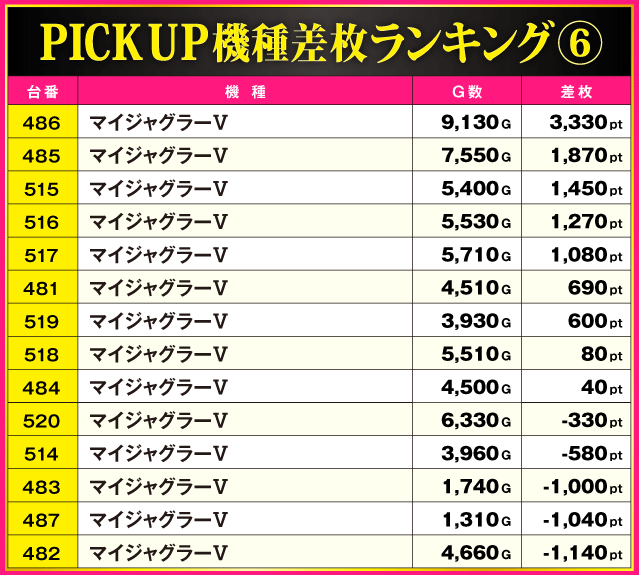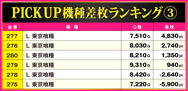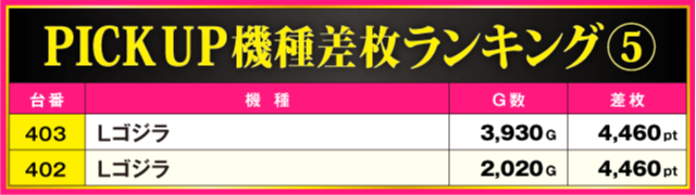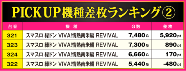 今回のPICK UP機種は全6機種で、ランキング上位機種以外からも多数の好調台を確認。『スマスロ 緑ドン VIVA!情熱南米編 REVIVAL』から+5,920pt、『L 東京喰種』と『Lゴジラ』から+4,000pt超が飛び出している。また、『マイジャグラーⅤ』は半数以上の台がプラス差枚となる安定感を披露しファンを喜ばせていた。