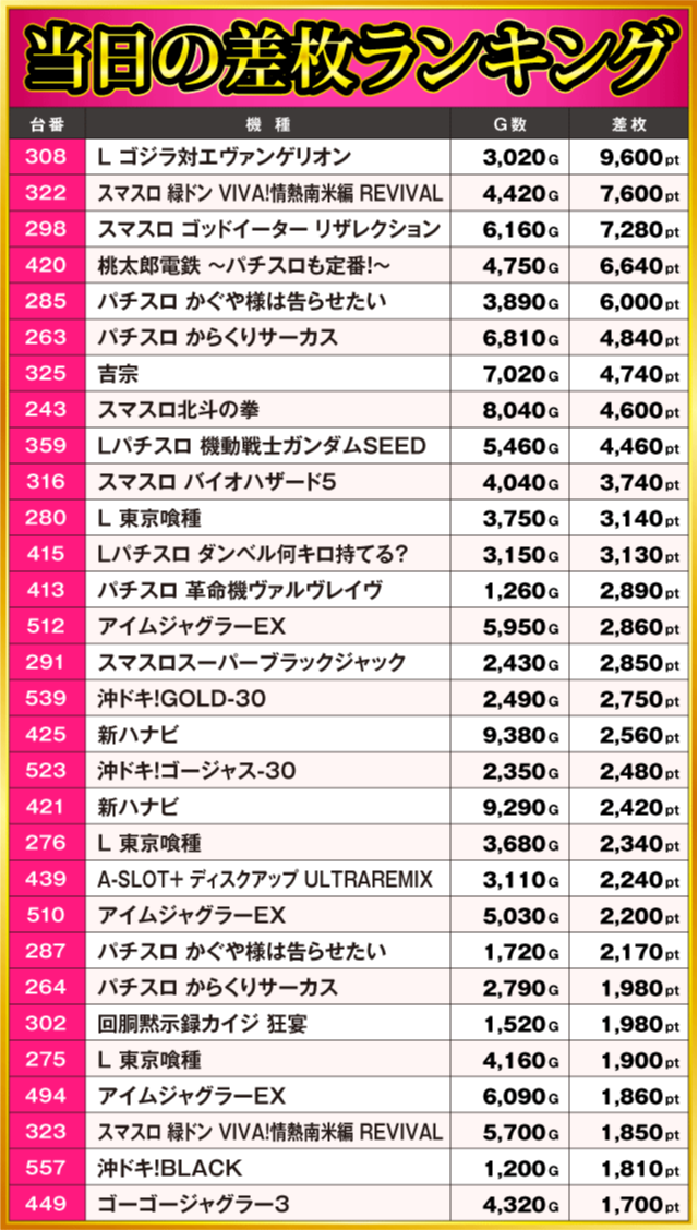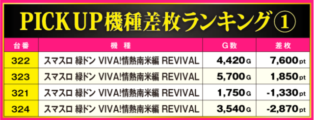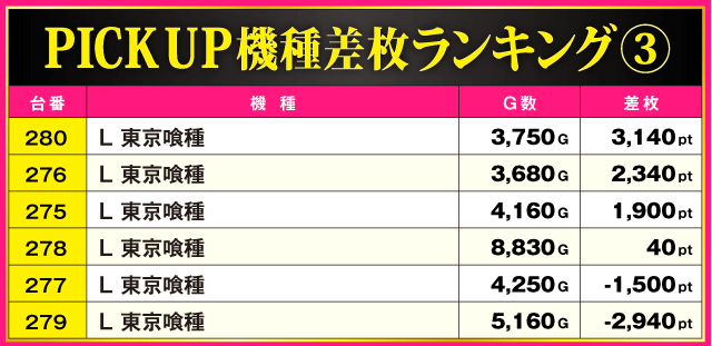 次にPICK UP機種の状況を見ていこう。差枚上位にランクインした『スマスロ 緑ドン VIVA!情熱南米編 REVIVAL』以外の機種も奮闘しており、『パチスロ かぐや様は告らせたい』からは+6,000ptが発生。さらに、『L 東京喰種』は全6台中4台がプラス差枚という見事な結果を残している。