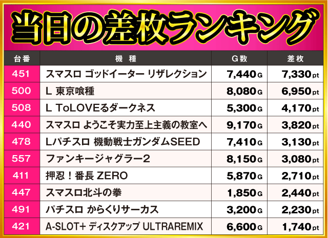 この日は、人気のスマスロを中心に多数の好調台を確認。そんな中、『スマスロ ゴッドイーター リザレクション』が+7,330ptを叩き出しランキングトップに。また、『スマスロ ようこそ実力至上主義の教室へ』と『Lパチスロ 機動戦士ガンダムSEED』が+3,000pt超を記録するなど、新台もしっかりと奮闘しファンを喜ばせていた。