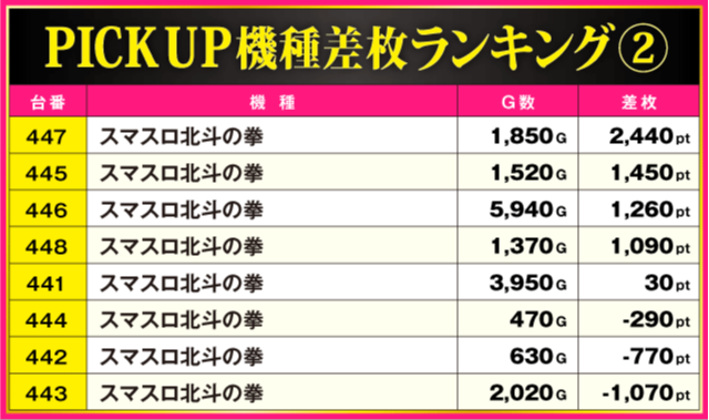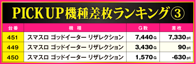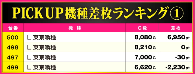 次にPICK UP機種の状況を見ていくと、『L 東京喰種』からは+6,950ptが発生。そして、『スマスロ北斗の拳』は全8台中5台、『スマスロ ゴッドイーター リザレクション』は全3台中2台がプラス差枚となっているだけに、ファンにとっては充実の一日となったのではないだろうか。