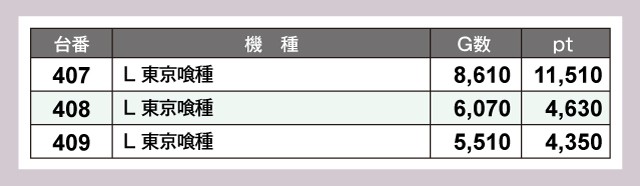 『L 東京喰種』407番台が+1万ptオーバー、次いで『スマスロ 緑ドン VIVA!情熱南米編 REVIVAL』398番台が+9,000ptオーバー、『スマスロバジリスク~甲賀忍法帖~絆2 天膳 BLACK EDITION』470番台が+8,000ptオーバーを達成し、スロットコーナーを大いに盛り上げていた。