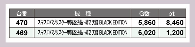 『スマスロバジリスク~甲賀忍法帖~絆2 天膳 BLACK EDITION』も2台揃ってプラスで実戦を終え、470番台は+8,460ptと微笑ましい状況だった。