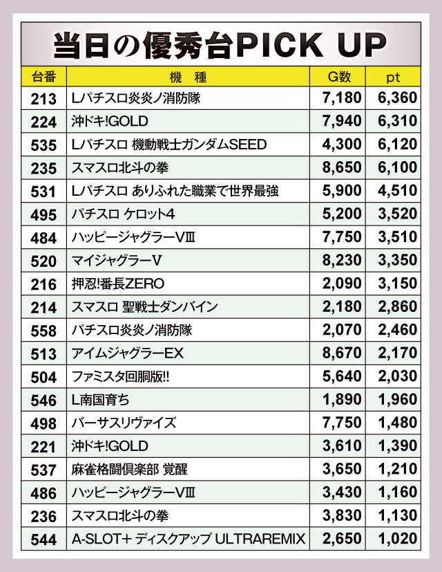 この日、盛り上がっていたのはスロットコーナー。『Lパチスロ炎炎ノ消防隊』213番台が+6,360pt、『沖ドキ!GOLD』224番台が+6,310ptと大成果をあげている。次いで『Lパチスロ 機動戦士ガンダムSEED』535番台が+6,120pt、『スマスロ北斗の拳』235番台が+6,100ptと、僅差のデッドヒートを繰り広げていた。