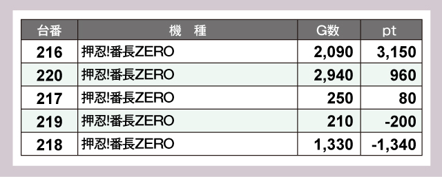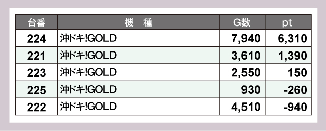 5台設置の『沖ドキ!GOLD』と『押忍!番長ZERO』はどちらも3台がプラスptで、トータルptでも大きくプラスとなった。