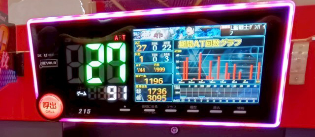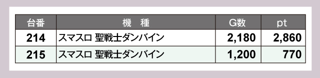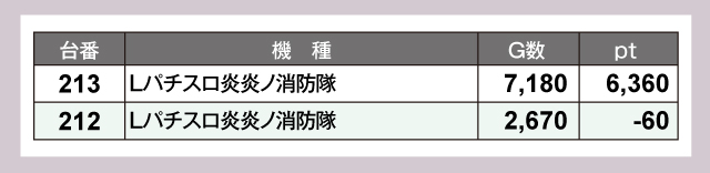 2台設置の『Lパチスロ炎炎ノ消防隊』では213番台が大きくプラスに引き上げていて、同じく2台の『スマスロ 聖戦士ダンバイン』はG数が若干、物足りないものの両台がプラスptに落ちついている。