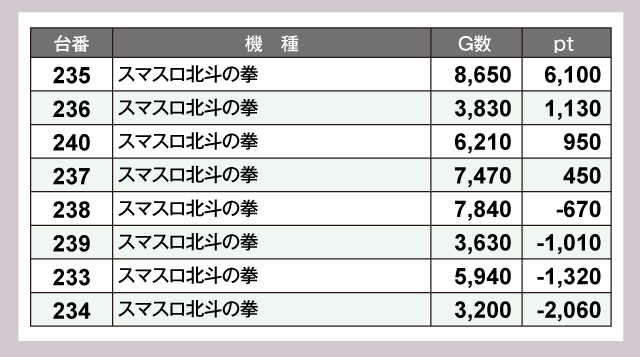 『スマスロ北斗の拳』は8台中4台がプラスpt。定番人気機種としての役目を果たしていた。