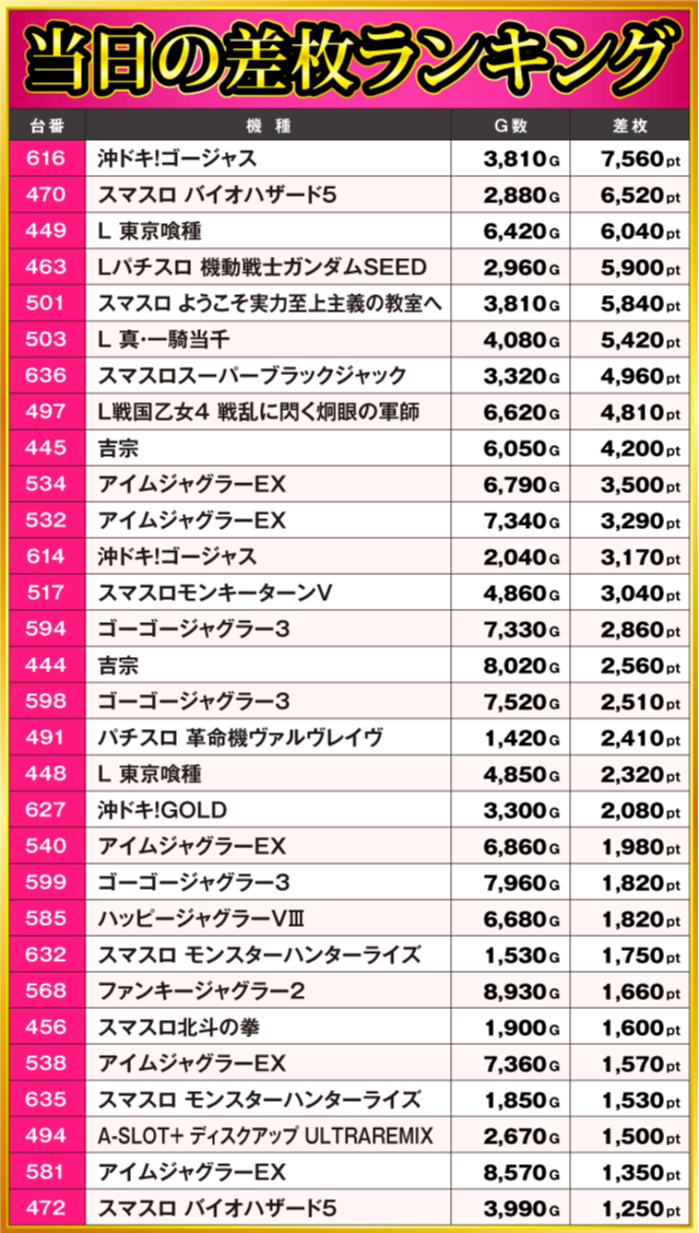 当日の差枚ランキング