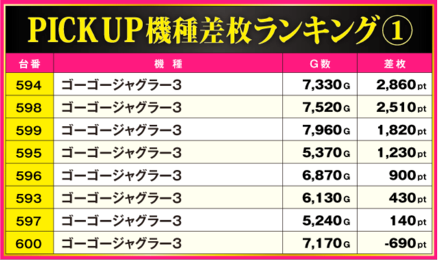 次にPICK UP機種の状況を見ていこう。ランキング上位台以外からも多数の好調台が確認されており、なかでも奮闘していたのが『ゴーゴージャグラー3』。594番台と598番台の+2,000pt超を筆頭に、全8台中7台がプラス差枚となる安定感を披露しファンを喜ばせていた。
