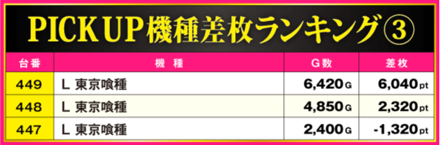 この日、最もプレイヤーの注目を集めたのが『沖ドキ!ゴージャス』で、616番台が+7,560ptを叩き出しランキングトップに。次いで『スマスロ バイオハザード5』と『L 東京喰種』が+6,000pt超を記録するなど、様々な機種からハイスコアが発生している。