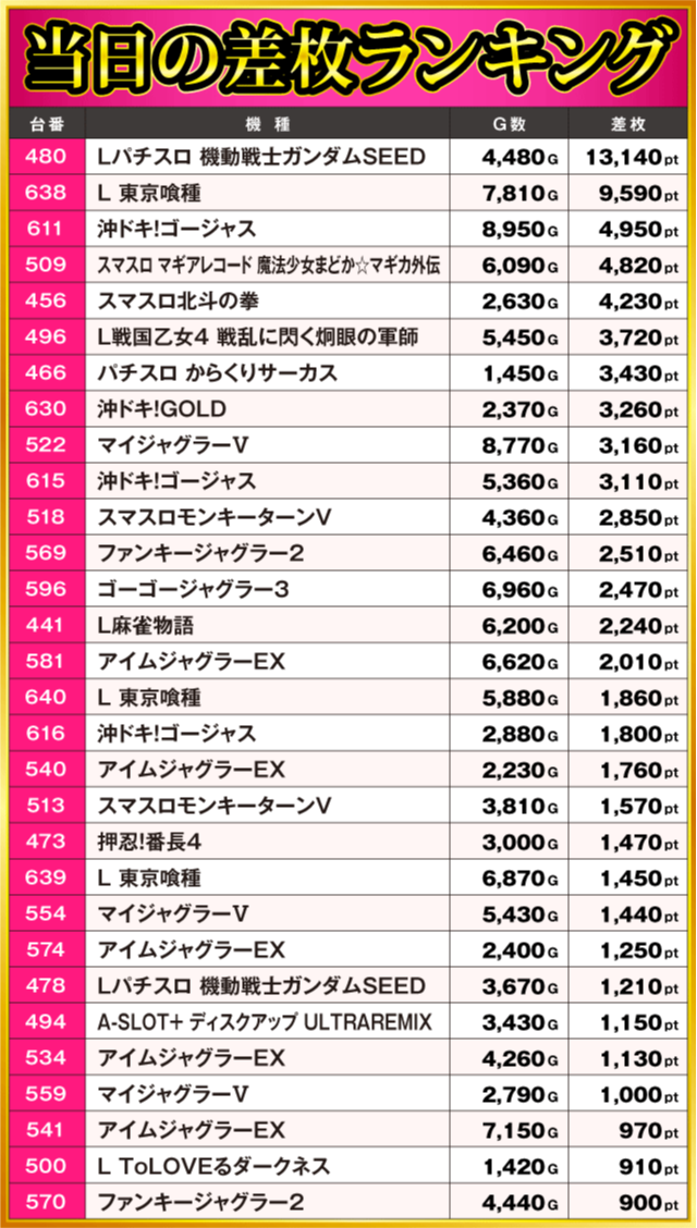 この日、最もプレイヤーの注目を集めたのが『Lパチスロ 機動戦士ガンダムSEED』で、480番台が圧巻の+13,140ptを叩き出しランキングトップに。続く2位にランクインした『L 東京喰種』も万枚目前の+9,590ptを記録するなど、ハイスコアが連発し店内を盛り上げていた。