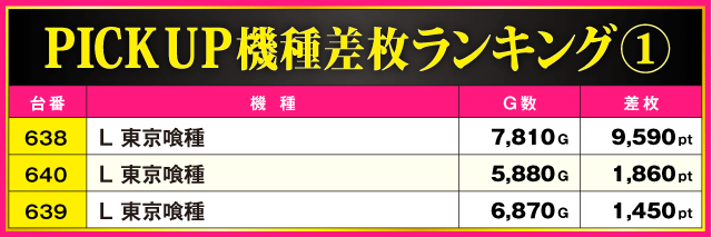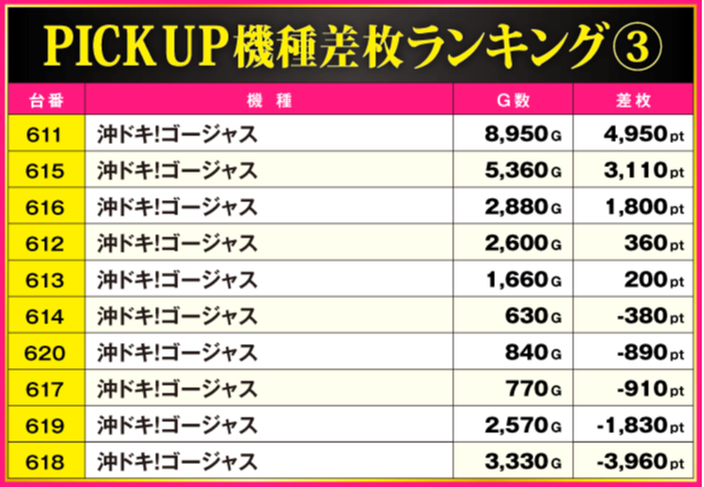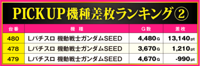 次にPICK UP機種の状況を見ていこう。ランキング上位機種の『Lパチスロ 機動戦士ガンダムSEED』と『L 東京喰種』からは他にも複数の好調台を確認。さらに、『沖ドキ!ゴージャス』からは+4,950pt、+3,110ptといった好成績が発生しており、3機種トータルの全16台中10台がプラス差枚となっている。