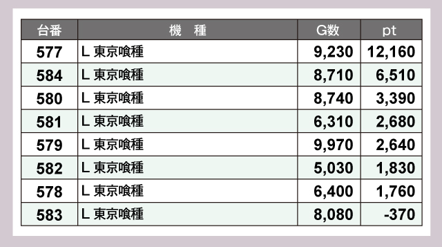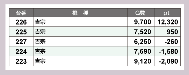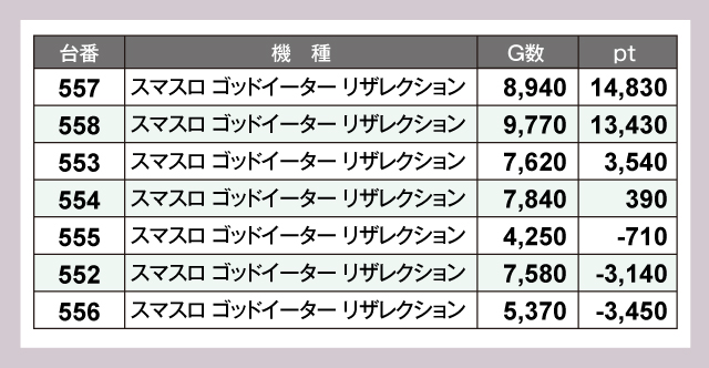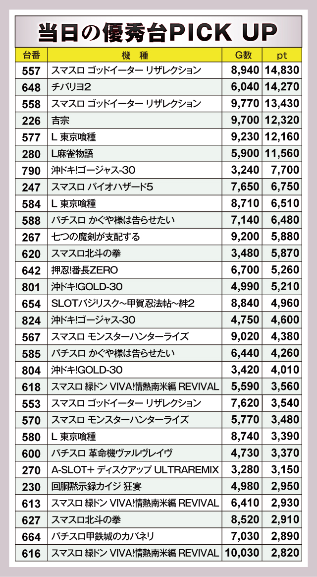 なんと1万pt超えが6台も出現。『スマスロ ゴッドイーター リザレクション』は557番台が+14,830ptで、558番台が+13,430ptと2台がすさまじい結果を残した。『チバリヨ2』も648番台が+14,270ptと圧倒的なptを叩きだしている。そして『吉宗』226番台が+12,320ptで、『L 東京喰種』577番台が+12,160pt。『L麻雀物語』280番台が+11,560ptと豪華絢爛なデータが並んでいた。