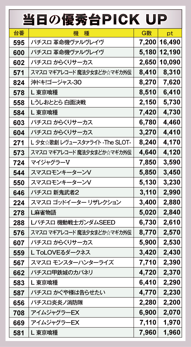 この日輝いたのは『パチスロ 革命機ヴァルヴレイヴ』。595番台が+16,490pt、600番台が+12,190ptと圧倒的な成績を残した。続いたのが『パチスロ からくりサーカス』602番台で+10,090pt。以下『スマスロ マギアレコード 魔法少女まどか☆マギカ外伝』571番台が+8,310pt、『沖ドキ!ゴージャス-30』824番台が+7,620ptと優秀台が埋めつくす見応えのあるデータとなっている。