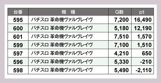 圧巻だったのは『パチスロ 革命機ヴァルヴレイヴ』。7台中5台がプラスで、そのうち万pt超えが2台とMVP級の成績だ。