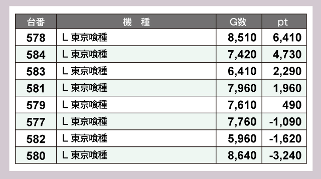 『L 東京喰種』は8台中5台がプラスで、全台が高稼働を維持。いまやホールの中心的存在であることを証明していた。